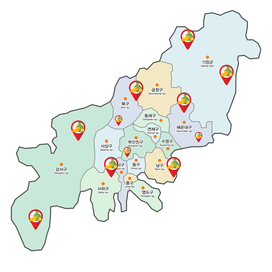 부산은 지역 기반 은행과 저축은행, 캐피탈이 고르게 분포해 있습니다.