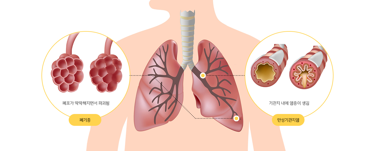 대표적으로 만성폐쇄성폐질환(COPD), 만성기관지염, 폐기종, 천식 등이 포함됩니다.